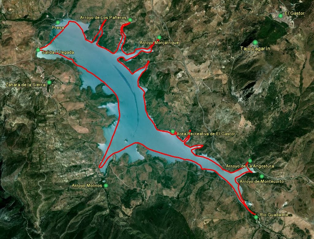 Como ya vimos el lunes pasado, el estado general de los embalses de la provincia de Cádiz es inmejorable. No se si las reservas de agua de un país se contabiliza en el PIB o en algún otro indicador económico, pero es una riqueza de la que no somos conscientes, no me quiero imaginar como estaríamos con la crisis que tenemos y los pantanos a menos del 15% de agua embalsada, como estuvieron hace años.El sábado, aprovechando el buen tiempo, fui a la sierra a dar una vuelta en moto. El embalse de Zahara-El Gastor estaba precioso. En la margen izquierda, entre la presa y Zahara, donde la antigua carretera se pierde en el agua, un grupo de kayakistas del Club Kayak Sevilla se preparaba para salir; al verlos me entró una "envidia cochina" y empecé a darle vueltas a la posibilidad de hacer una travesía por el embalse, decidí hacerla al día siguiente, la subida de las temperaturas es inminente y ya no quedan días antes del verano.